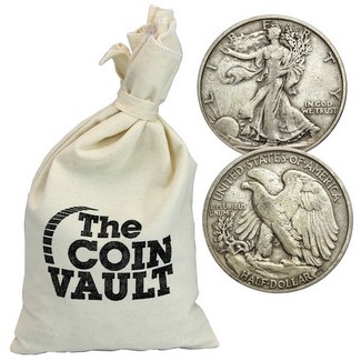 Includes 100 circulated Walking Liberty half dollars each struck in 90% silver. The coins will arrive in The Coin Vault logo cloth bag.